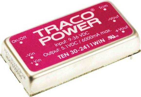 Gleichspannungswandler Typ Traco TEN 30...WIN. 30 W-Wandler mit 4 : 1 Weitbereichseingang. Merkmale: dauerkurzschlussfest, Unterspannungsabschaltung, externe Ein-/Ausfunktion, einstellbare Ausgangsspannung, Regelabweichungen bei Eingangsänderung: max. ±0,2 % bei Single- Dualmodelle, Haupt-/Nebeneingang 1,0/5,0 % (bei Triplemodelle), Einstellgenauigkeit der Ausgangsspannung: ±1,0%, Restwelligkeit: 150 mVpp, 100 mVpp (bei 1,5 V bis 5,1 V Modelle), Haupt-/Nebenausgang 50/75 mVpp (bei Tripleausgang), Einschaltzeit: 30 ms, Betriebstemperatur: –40 bis +75 °C, MTBF: Single- und Dualmodelle 435 Tsd. h, Triplemodelle 320 Tsd. h. Mit Eingangsspannungsbereich 9,0 bis 36 VDC. Technische Merkmale (Typ, Ausgangsanzahl, Ausgangsspannung/Ausgangsstrom, Wirkungsgrad): TEN 30-2411WIN, 1 Ausg., 5,1 VDC/6,0 A, 88 %