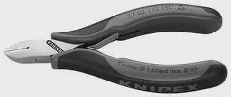 Seitenschneider, 77 02 115 ESD, Knipex Für feine Schneidarbeiten, z. B. in Elektronik und Feinmechanik. Griffe elektrisch ableitend - dissipativ. Stabiles, durchgestecktes und spielfreies Gelenk. Reibungsarme Doppelfeder für ein sanftes und gleichmäßiges Öffnen. Die Spiegelpolitur bietet in Verbindung mit einem feinen Ölfilm einen guten Rostschutz - keine Störungen im Schaltkreis durch abblätternde Chromteile. Schneiden zusätzlich induktiv gehärtet. Griffe mit zweifarbigen Mehrkomponenten-Griffhüllen schwarz/grau. Spezial-Werkzeugstahl in Sondergüte, geschmiedet, mehrstufig ölgehärtet Modell: Runder Kopf, mit kleiner Facette. Schneidenhärte ca. 60 HRC. Technische Daten Material: Spezialstahl Gewicht: 82 g Länge: 115 mm